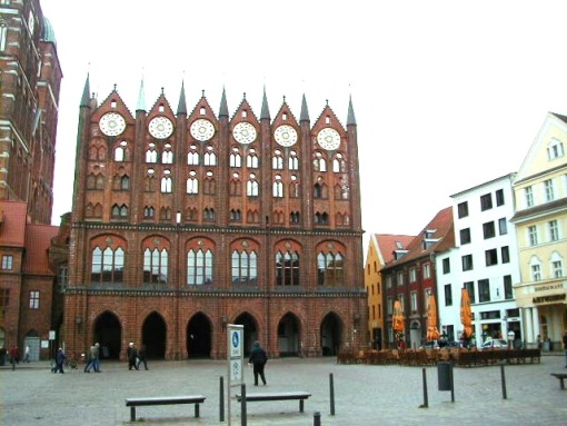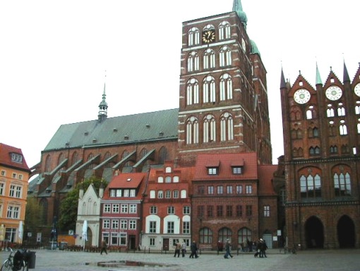 In Stralsunds Altstadt, die Nikolaikirche und das Rathaus am Alten Markt.